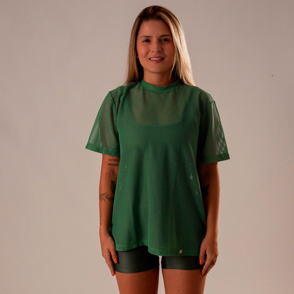 Camiseta Pri estilo over tamanho ÚNICO em Poliamida, tecido em tela possui comprimento e mangas mais alongados.