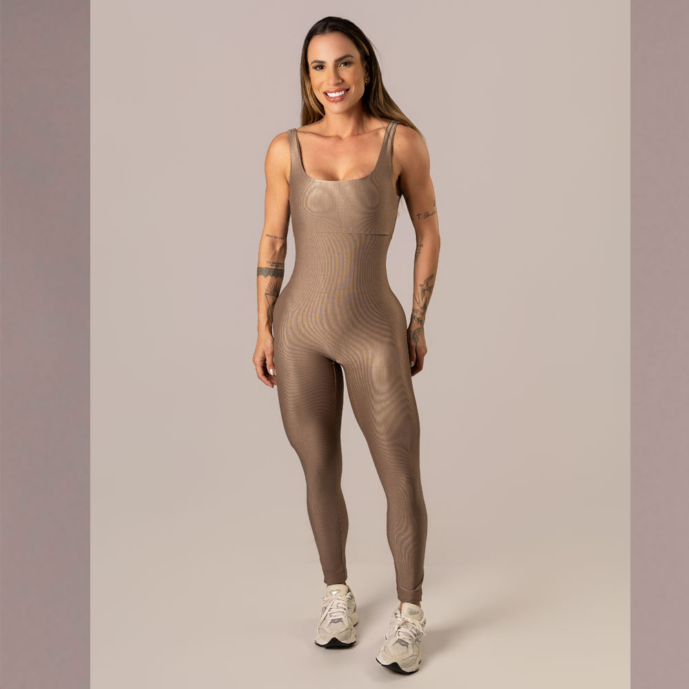 Macacão calça Helo em Poliamida, tecido com brilho canelado alta compressão possui alças mais largas.
