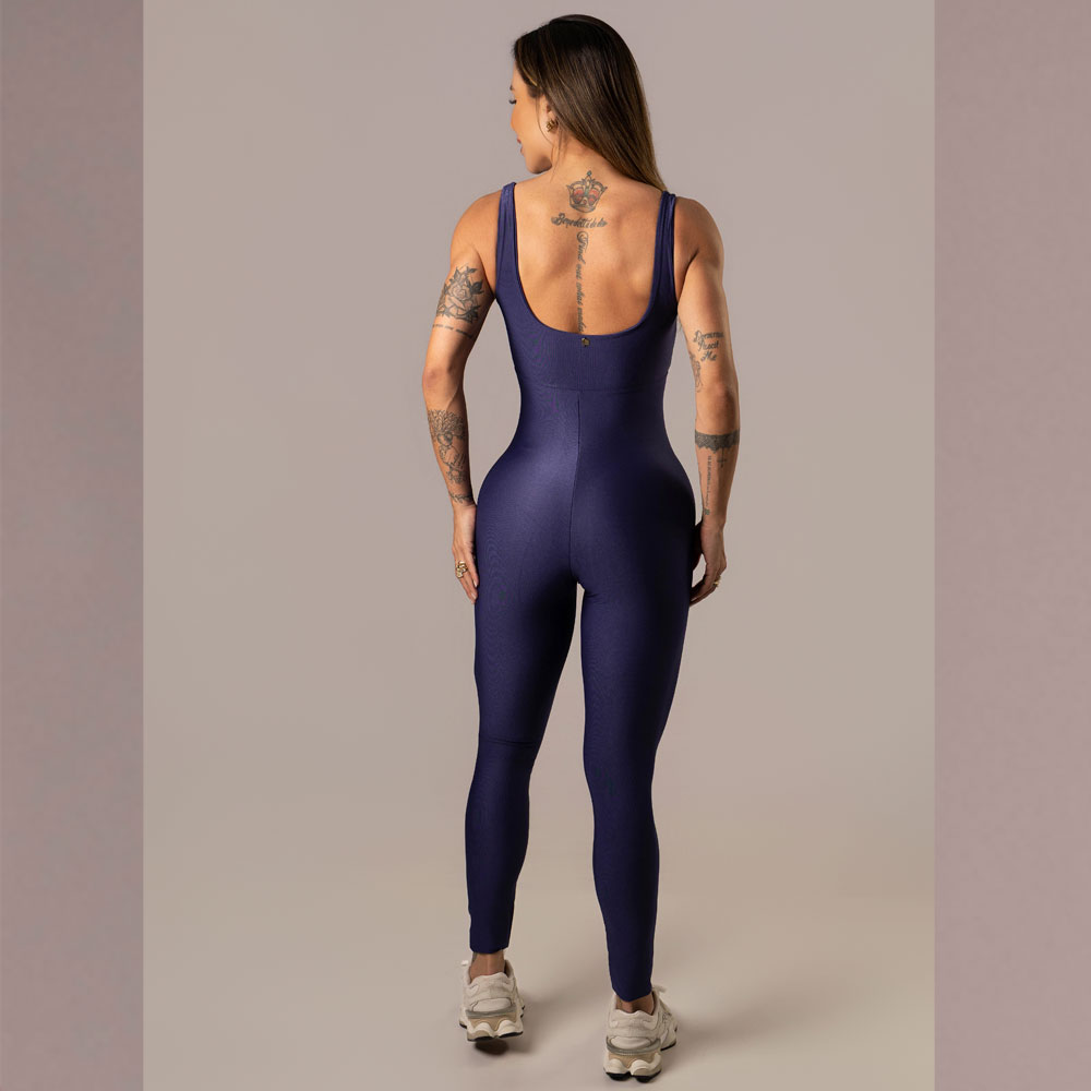 Macacão calça Helo em Poliamida, tecido com brilho canelado alta compressão possui alças mais largas.